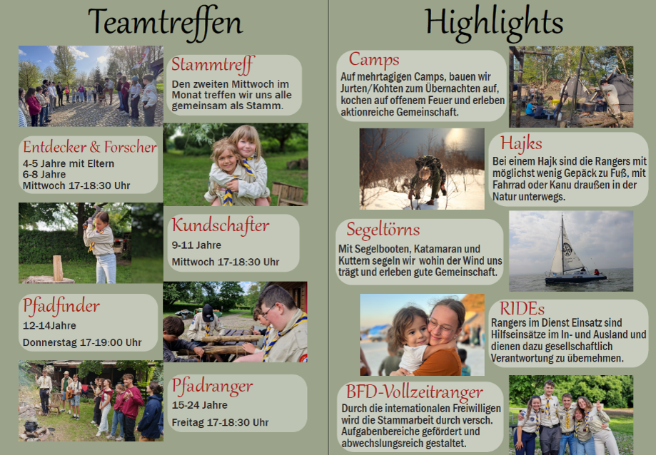 Die Ranger sind in altergerechte Teams unterteilt. Diese Treffen sich wöchentlich. Stammtreff, alle zusammen ist einmal im Monat.